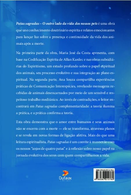 Patas sagradas – O outro lado da vida dos nossos pets é uma obra que une conhecimento doutrinário espírita e relatos emocionantes para lançar luz sobre a presença e continuidade da vida dos animais após a morte. Na primeira parte da obra, Maria José da Costa apresenta, com base na Codificação Espírita de Allan Kardec e nas obras subsidiárias do Espiritismo, um estudo profundo sobre o papel espiritual dos animais, seu processo evolutivo e sua integração ao plano espiritual. Na segunda parte, Ana Cristina Souza compartilha experiências práticas de Comunicação Interespécies, revelando mensagens recebidas de animais desencarnados por meio de um sensível e respeitoso trabalho mediúnico. Ao invés de contradições, o leitor encontrará em Patas sagradas complementaridade: a teoria ilumina a prática, e a prática confirma a teoria. Esta obra demonstra que o amor entre humanos e seus animais não se encerra com a morte — ele se transforma, atravessa planos e se revela em novas formas de ligação afetiva. Mais do que uma leitura espiritualista, Patas sagradas é um convite à reconexão com os nossos “anjos de quatro patas” e à reflexão sobre nosso papel na jornada evolutiva dos seres com quem compartilhamos a vida.