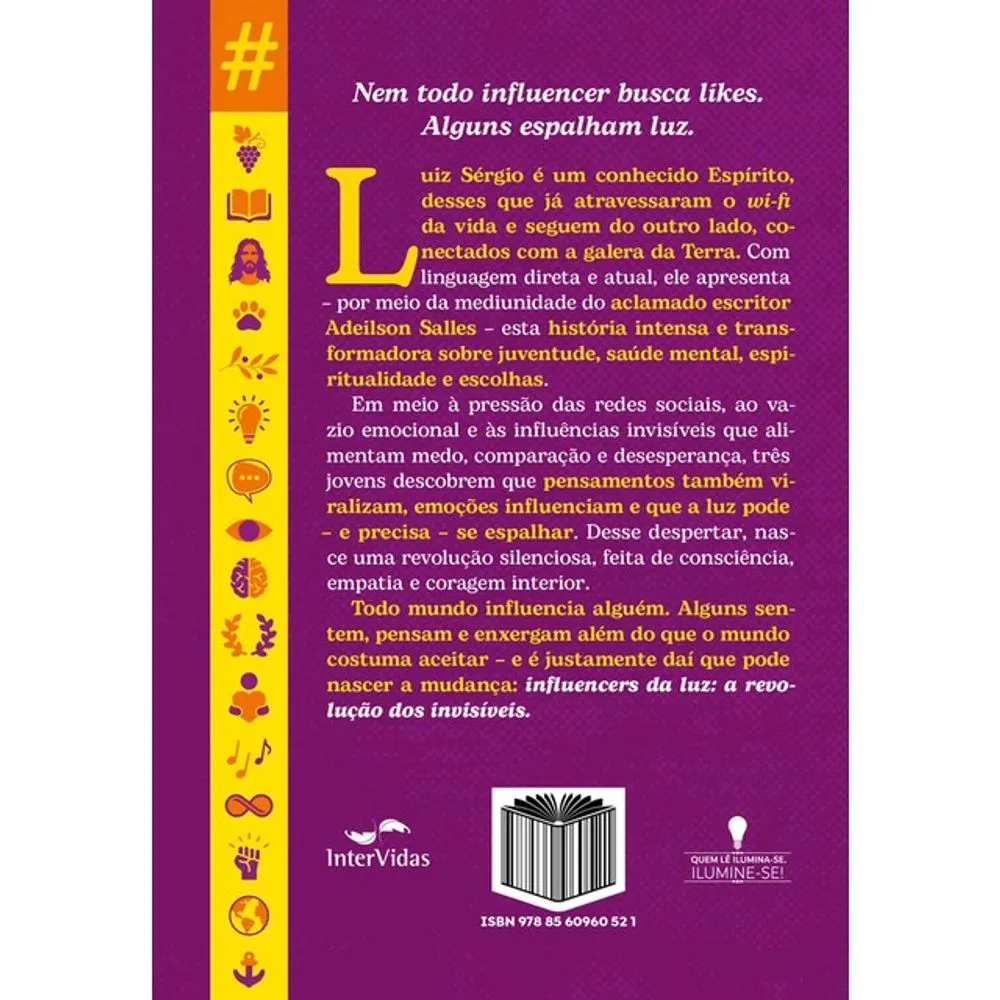Nem todo influencer busca likes. Alguns espalham luz. Luiz Sérgio é um conhecido Espírito, desses que já atravessaram o wi-fi da vida e seguem do outro lado, conectados com a galera da Terra. Com linguagem direta e atual, ele apresenta – por meio da mediunidade do aclamado escritor Adeilson Salles – esta história intensa e transformadora sobre juventude, saúde mental, espiritualidade e escolhas. Em meio à pressão das redes sociais, ao vazio emocional e às influências invisíveis que alimentam medo, comparação e desesperança, três jovens descobrem que pensamentos também viralizam, emoções influenciam e que a luz pode – e precisa – se espalhar. Desse despertar, nasce uma revolução silenciosa, feita de consciência, empatia e coragem interior. Todo mundo influencia alguém. Alguns sentem, pensam e enxergam além do que o mundo costuma aceitar – e é justamente daí que pode nascer a mudança: “Influencers da Luz: a Revolução dos Invisíveis