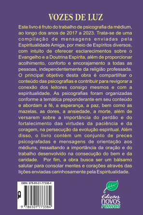Este livro é fruto do trabalho de psicografia da médium, ao longo dos anos de 2017 a 2023. Trata-se de uma compilação de mensagens enviadas pela Espiritualidade Amiga, por meio de Espíritos diversos, com intuito de oferecer esclarecimentos sobre o Evangelho e a Doutrina Espírita, além de proporcionar acolhimento, conforto e encorajamento a todas as pessoas, independentemente da religião professada. O principal objetivo desta obra é compartilhar o conteúdo das psicografias e contribuir para revigorar a conexão dos leitores consigo mesmos e com a espiritualidade. As psicografias foram organizadas conforme a temática preponderante em seu conteúdo e abordam a fé, a esperança, a paz, bem como as mazelas, as dores, a ansiedade, a morte, além de versarem sobre a importância do perdão e do fortalecimento das virtudes da paciência e da coragem, na persecução da evolução espiritual. Além disso, o livro contém um conjunto de preces psicografadas e mensagens de orientação aos médiuns, ressaltando a importância da oração e do trabalho desenvolvido na consecução do bem e da caridade. Por fim, a obra busca ser um bálsamo salutar para consolar mentes e corações através das lições enviadas carinhosamente pela Espiritualidade.