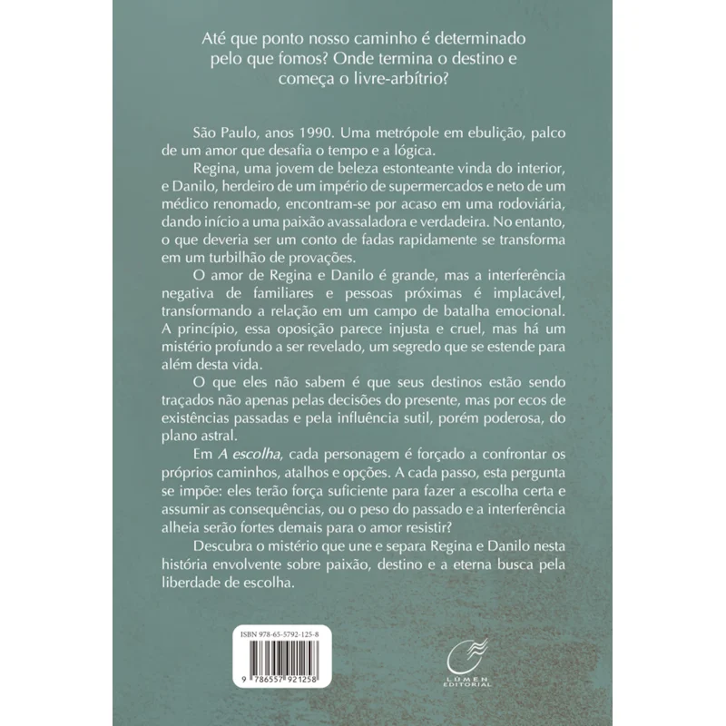 São Paulo, anos 1990. Uma metrópole em ebulição, palco de um amor que desafia o tempo e a lógica. Regina, uma jovem de beleza estonteante vinda do interior, e Danilo, herdeiro de um império de supermercados e neto de um médico renomado, encontram-se por acaso em uma rodoviária, dando início a uma paixão avassaladora e verdadeira. No entanto, o que deveria ser um conto de fadas rapidamente se transforma em um turbilhão de provações. O amor de Regina e Danilo é grande, mas a interferência negativa de familiares e pessoas próximas é implacável, transformando a relação em um campo de batalha emocional. A princípio, essa oposição parece injusta e cruel, mas há um mistério profundo a ser revelado, um segredo que se estende para além desta vida. O que eles não sabem é que seus destinos estão sendo traçados não apenas pelas decisões do presente, mas por ecos de existências passadas e pela influência sutil, porém poderosa, do plano astral. Até que ponto nosso caminho é determinado pelo que fomos? Onde termina o destino e começa o livre-arbítrio? Em A escolha, cada personagem é forçado a confrontar os próprios caminhos, atalhos e opções. A cada passo, esta pergunta se impõe: eles terão força suficiente para fazer a escolha certa e assumir as consequências, ou o peso do passado e a interferência alheia serão fortes demais para o amor resistir? Descubra o mistério que une e separa Regina e Danilo nesta história envolvente sobre paixão, destino e a eterna busca pela liberdade de escolha.