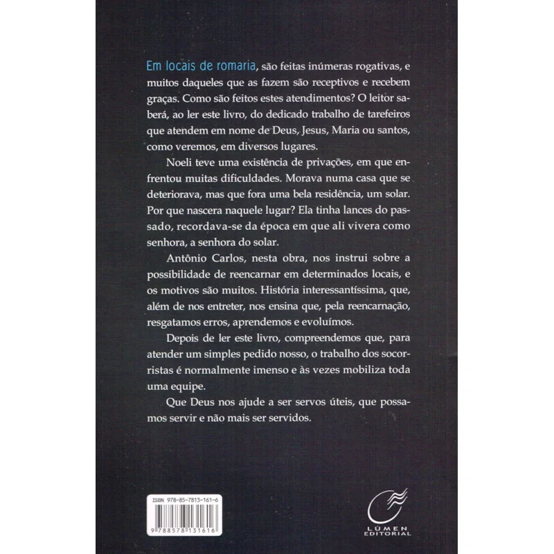 Noeli teve uma existência de privações, em que enfrentou muitas dificuldades. Morava numa casa que se deteriorava, mas que antigamente fora uma bela residência, um solar. Por que nascera naquele lugar? Ela tinha visões do passado, recordava-se da época em que ali vivera como senhora, a senhora do solar. Mas, hoje, era pobre e vivia dos produtos de sua horta. Até que começou a fazer remédios e pomadas com ervas, curando muitas pessoas. Mesmo depois de sua morte, os pedidos de bênçãos e curas nãopararam, como se ela fosse uma santa. E como são feitos esses atendimentos na espiritualidade? O leitor saberá, ao ler este livro, do dedicado trabalho de tarefeiros que atendem em nome de Deus, Jesus, Maria ou santos, em diversos lugares distintos.Vamos compreender que, para atender um simples pedido nosso, o trabalho dos socorristas espirituais é imenso e, às vezes, mobiliza toda uma equipe em benefício do encarnado.