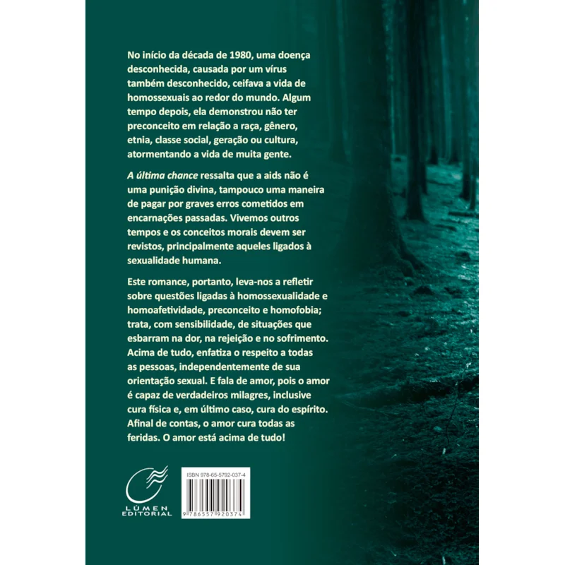 “No início da década de 1980, uma doença desconhecida, causada por um vírus também desconhecido, ceifava a vida de homossexuais ao redor do mundo. Algum tempo depois, ela demonstrou não ter preconceito em relação a raça, gênero, etnia, classe social, geração ou cultura, atormentando a vida de muita gente. A última chance ressalta que a aids não é uma punição divina, tampouco uma maneira de pagar por graves erros cometidos em encarnações passadas. Vivemos outros tempos e os conceitos morais devem ser revistos, principalmente aqueles ligados à sexualidade humana. Este romance, portanto, leva-nos a refletir sobre questões ligadas à homossexualidade e homoafetividade, preconceito e homofobia; trata, com sensibilidade, de situações que esbarram na dor, na rejeição e no sofrimento. Acima de tudo, enfatiza o respeito a todas as pessoas, independentemente de sua orientação sexual. E fala de amor, pois o amor é capaz de verdadeiros milagres, inclusive cura física e, em último caso, cura do espírito. Afinal de contas, o amor cura todas as feridas. O amor está acima de tudo! “