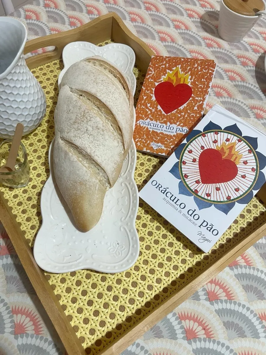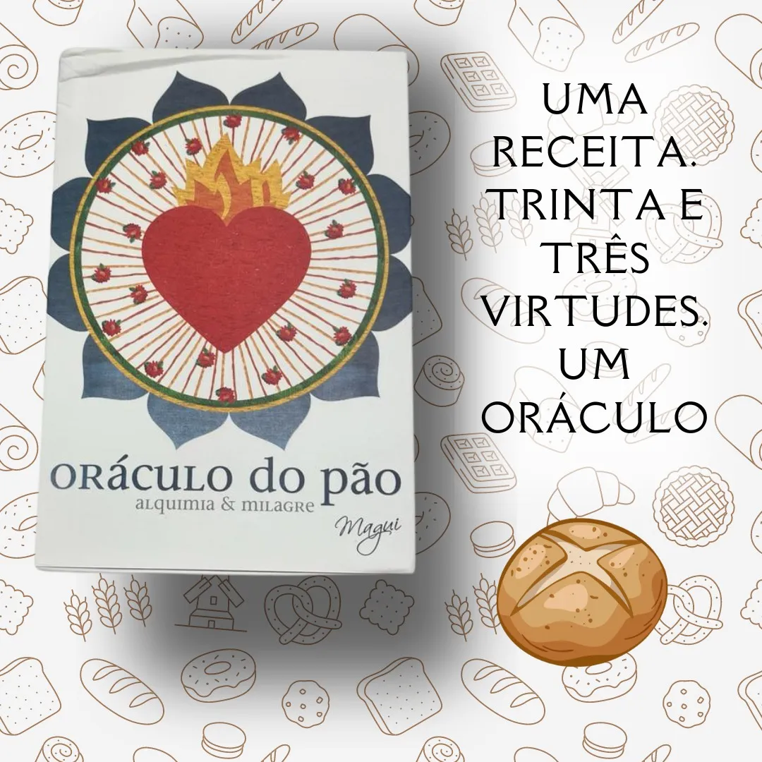 Caixa contendo livro e 33 cartas do oráculo. ” Para fazer o pão. Para entrar em contato com a alma. Para abrir o coração. Uma receita, trinta e três virtudes. Um oráculo para se usar com alegria, com sabedoria. Como mandar o coração.”
