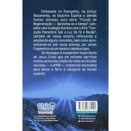 Embasada no Evangelho, no Antigo Testamento, na Doutrina Espírita e demais fontes idôneas, esta obra: “Mundo de Regeneração – Aproxima-se o tempo” completa uma duologia literária com o livro “Transição Planetária Sob a Luz da Fé e Razão” – também de nossa autoria, reforçando e ampliando alguns conceitos, bem como apresentando-os sob novos prismas, por serem fragmentos de um mesmo caleidoscópio. Dá destaque à insuperável importância de Jesus Cristo que em extremo sacrifício revelou ao mundo o êxito de todas as virtudes reunidas – o AMOR – credencial necessária para elevar a Terra à categoria de mundo superior. No decorrer da próxima quarta década, quando a última fronteira entre Mundo de Expiação e Provas para Mundo de Regeneração for definitivamente transpassada, o planeta Terra e sua humanidade estarão no limiar de uma nova era.